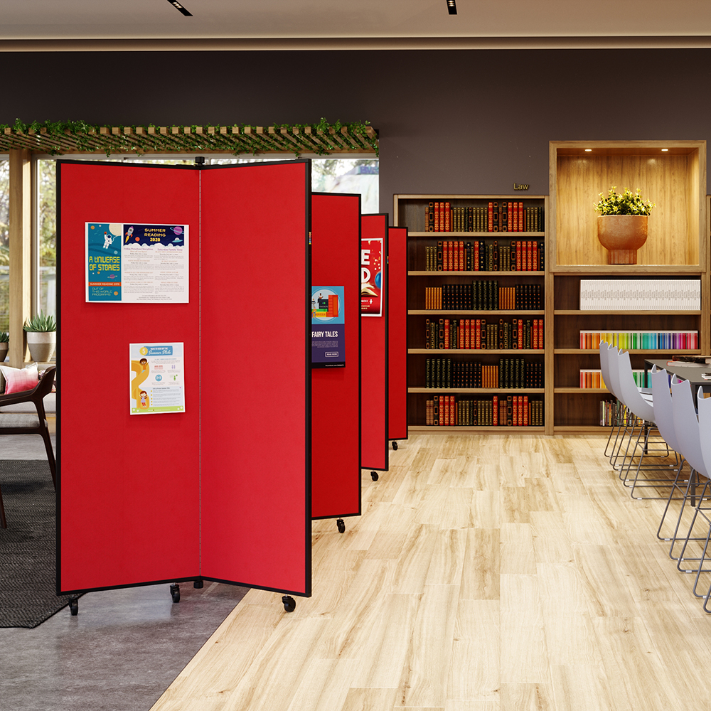 Select from either the 3 or 6 winged art display towers. Both systems are constructed from sound absorbing, tack-able panels covered with long lasting fabric. Screenflex Display Systems arrive fully assembled and ready for use! Create instant information stations, display artwork, registration materials or directions. If desired, the unit folds compactly when not in use. Screenflex Art Display Systems are trimmed with the same sturdy black powder coated steel frames and durable locking caster wheels as our other portable room divider products.