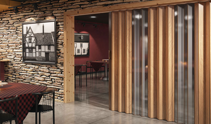 A new concept in better security is now in sight: Woodfold's Visifold Series 440 see-through commercial and retail security doors. Custom-crafted of heavy-duty acrylic panels and our exclusive steel hardware hinge system, this Series helps reduce annoying noise and dust while providing a welcome sense of openness. Designed to present an inviting entrance to retail and hospitality settings with moderate security needs, our Series 440 doors also serve as a unique decorative touch, and can be crafted to incorporate acrylic panels with those made of hardwood or Vinyl-Lam.